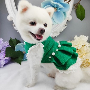 大型犬もOK 濃いめグリーンとお花のワンポイントワンピース