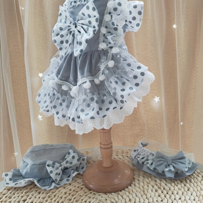大型犬もOK 帽子と首飾りもセット!モノクロドットのリボンワンピース